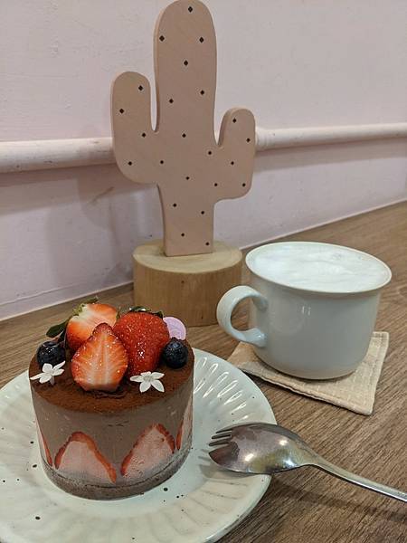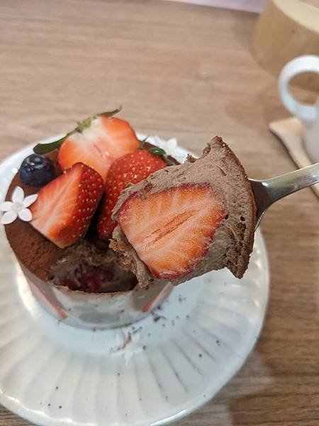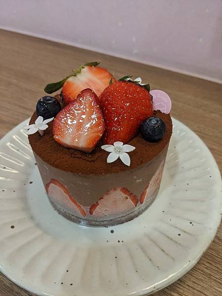 巧克力芙連上面灑上偏苦不甜厚厚的巧克力粉,再用草莓+藍莓+小花點綴,這個畫面看了會讓人心花怒放RRR~