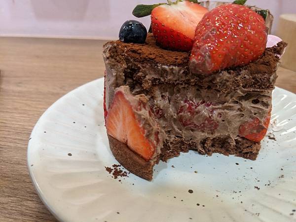 中間是巧克力慕斯甜度也很剛好,不苦微微甜~ 這個甜度搭配帶點甜又微微酸的草莓,原來…這就是幸福的滋味 (那朵云心花盛開中~)